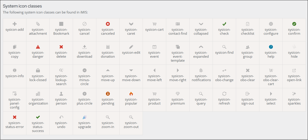 iMIS system icons have been updated from PNG to SVG (.svg) for the enhanced scalability, smaller file size, and customization options that the SVG file format offers. All out-of-the-box website themes have been updated to support the new SVG icons; however, customized themes may require additional adjustments. Review the following to determine if your custom theme must be updated.