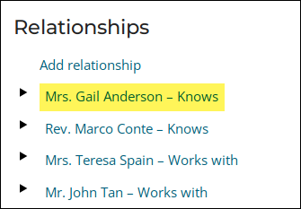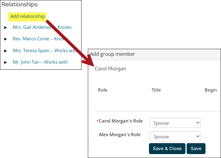 Example: If you edit Alex Morgan’s record to indicate that he is the spouse of Carol Morgan, then that relationship will also appear in Carol’s record.
