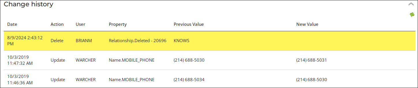 The relationship is removed from both contacts and the deletion is recorded in their change logs. The original relationship type is shown as the previous value leaving the new value empty. For more information, see Change history overview.