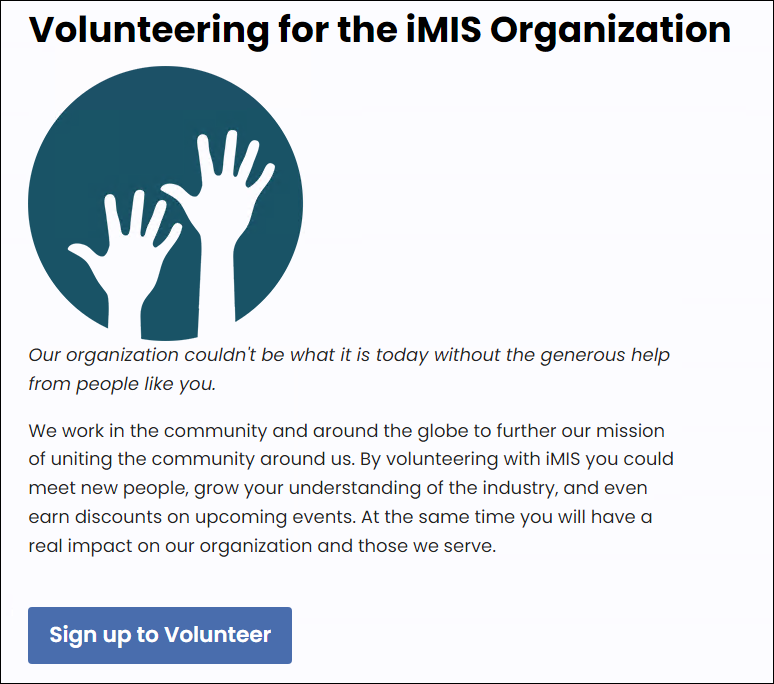 Members have the opportunity to Sign up to Volunteer and begin entering information that you can use to track volunteers, and assign them to those areas and opportunities where their skills and experiences would be most beneficial.