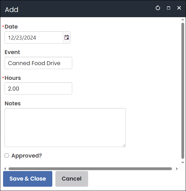- Enter the number of Hours spent volunteering at this event.