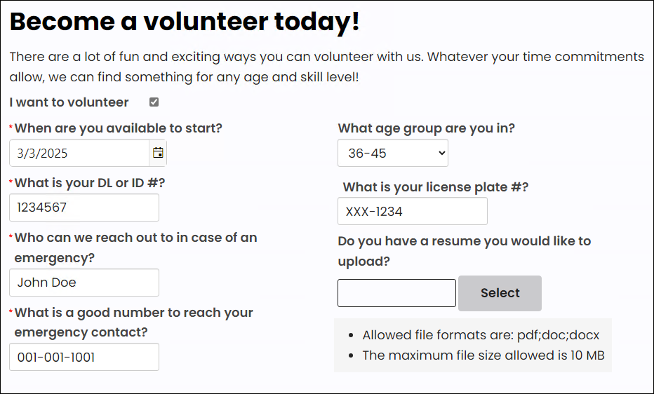 - Resume - Volunteers can also attach their resume or any relevant file. Allowed file formats are PDF, DOC and DOCX.