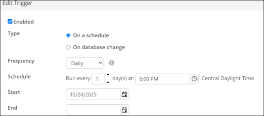 • Schedule: Run every 1 days at desired time. In this example, 6:00 PM is chosen, but you may choose any time that fits your needs; for example, you may want to choose a time based on the gateway settlement time. See the Stripe or Global Payments documentation for more information regarding settlement times.