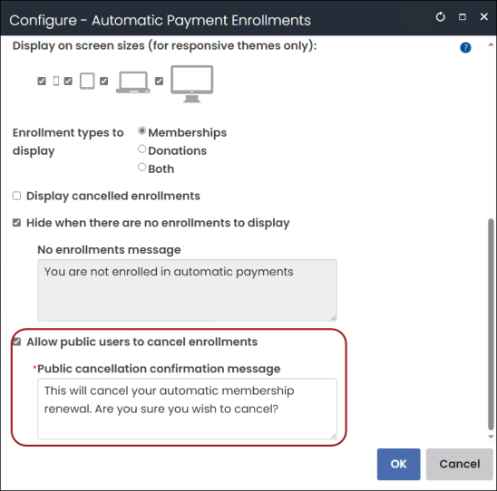 To allow members and donors to cancel their own enrollments, enable Allow public users to cancel enrollments on the Automatic Payment Enrollments content item. Once enabled, members and donors have access to cancel their own enrollments directly from their account pages.