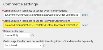- The Communication Template to use for Payment Confirmations (Settings > Commerce > General) is tailored for your organization. For more information, see Defining the default template used for payment confirmations.