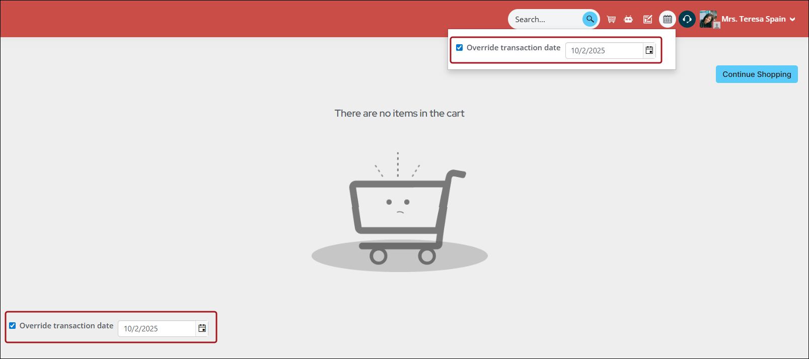 - Enable Override transaction date from either the cart or the top navigation.