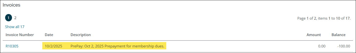 Example: A member sends a check for 100.00 to an association but did not indicate what the payment was for. Staff users must record that the payment was deposited, but the contact did not specify how to apply the payment. The staff user enters the payment as a prepayment to the member's account.