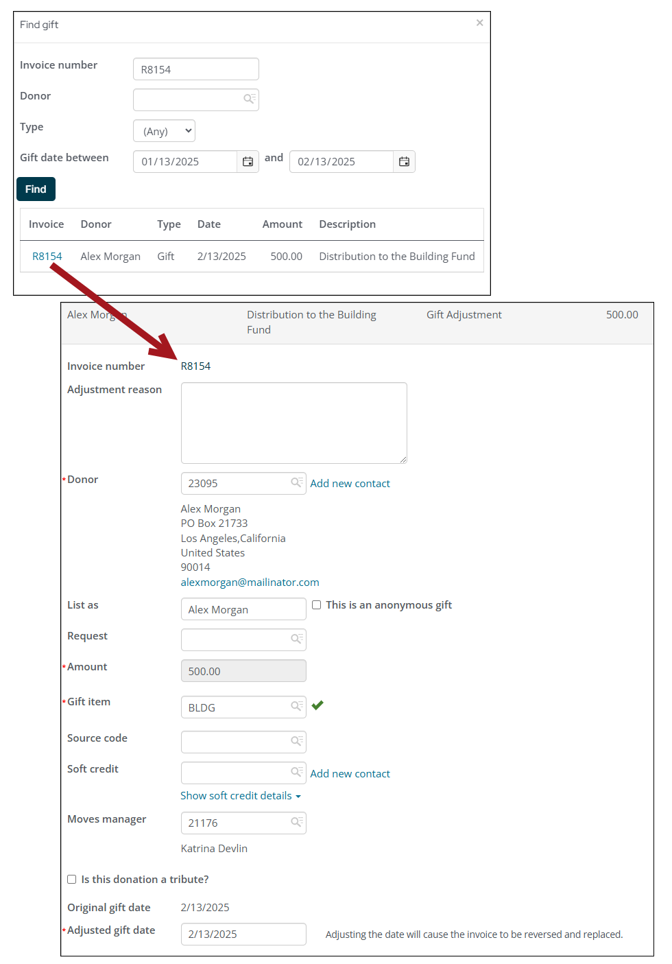 - When the date or gift item is adjusted, the original invoice is reversed, and a new invoice is created.