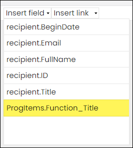 - From the Insert field drop-down, select {#ProgItems.Function_Title}.