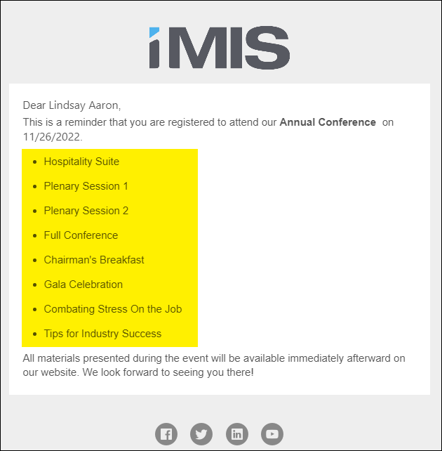 The following example assumes you are a staff member who wants to send a communication to all registrants of the Annual Conference. The purpose of the communication is to remind the registrants of the conference date, and to remind them of the program items they registered for. To do this, you want to use a formula so you can send the same communication to all registrants, and not have to worry about customizing the email for each individual person.