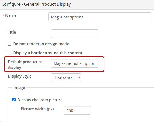 - In the Default product to display field, enter the name of the subscription non-dues billing cycle (Cycle name) created previously, replacing spaces with underscores.