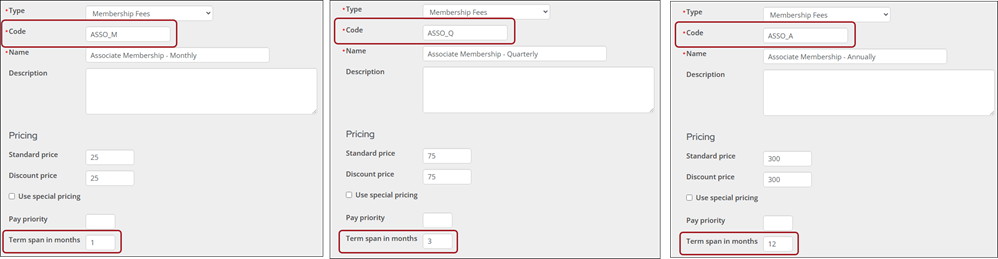 For example, if you need to offer three different membership terms (monthly, quarterly, or annually) for the Associate Membership, the billing product codes may look like the following: