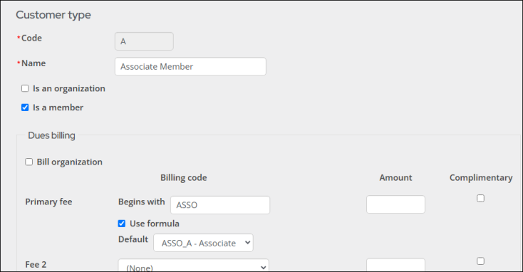 - From the Primary fee field, enable Use formula and enter the designator you chose above (for this example, the designator is ASSO) in the Begins with field.