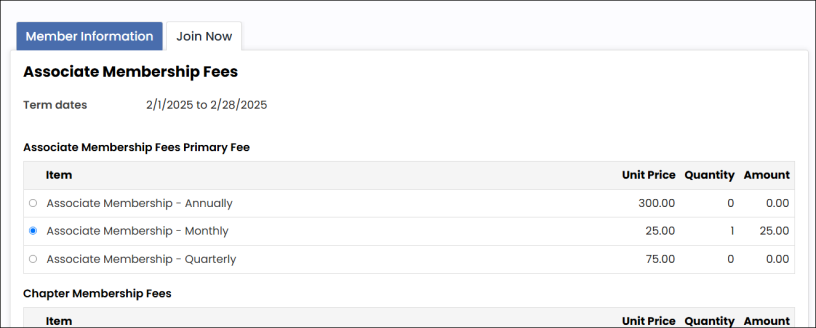 Note: Any additional billing products included in the join or renewal will reflect the primary fee's term length, with the exception of Miscellaneous and Voluntary items which will always reflect the product's price regardless of term length.