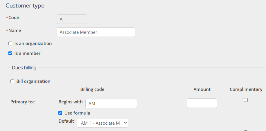 Example: A staff user adds a new contact to iMIS and manually changes their Customer type to this customer type. The staff user generates a billing invoice for the contact, and the contact is billed the Default product as they have no existing active subscriptions that match the formula. If you need to be able to choose between the multiple primary fees, use the Join Now button instead of manually changing the customer type.