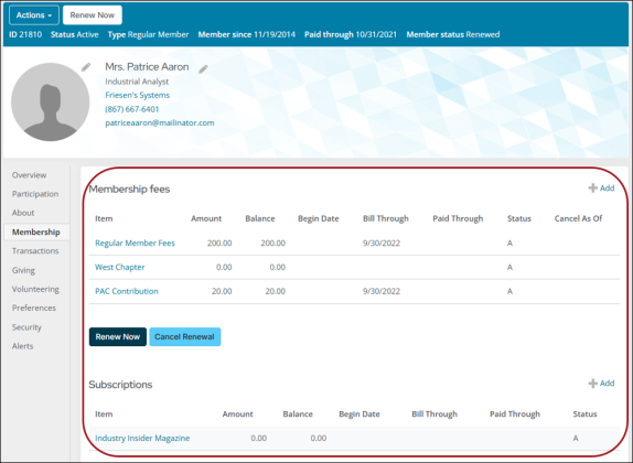 Subscriptions | Allows staff user to edit subscription data for next billing term. Details the status of the subscription data that drives the billing and the contact’s overall membership and/or subscriber status. |