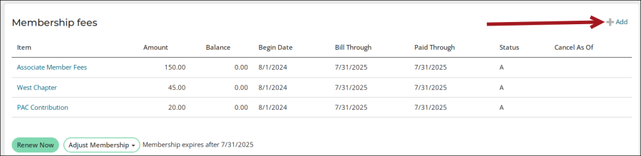 The +Add button allows staff users to easily add a new subscription item prior to billing a member for their next term.