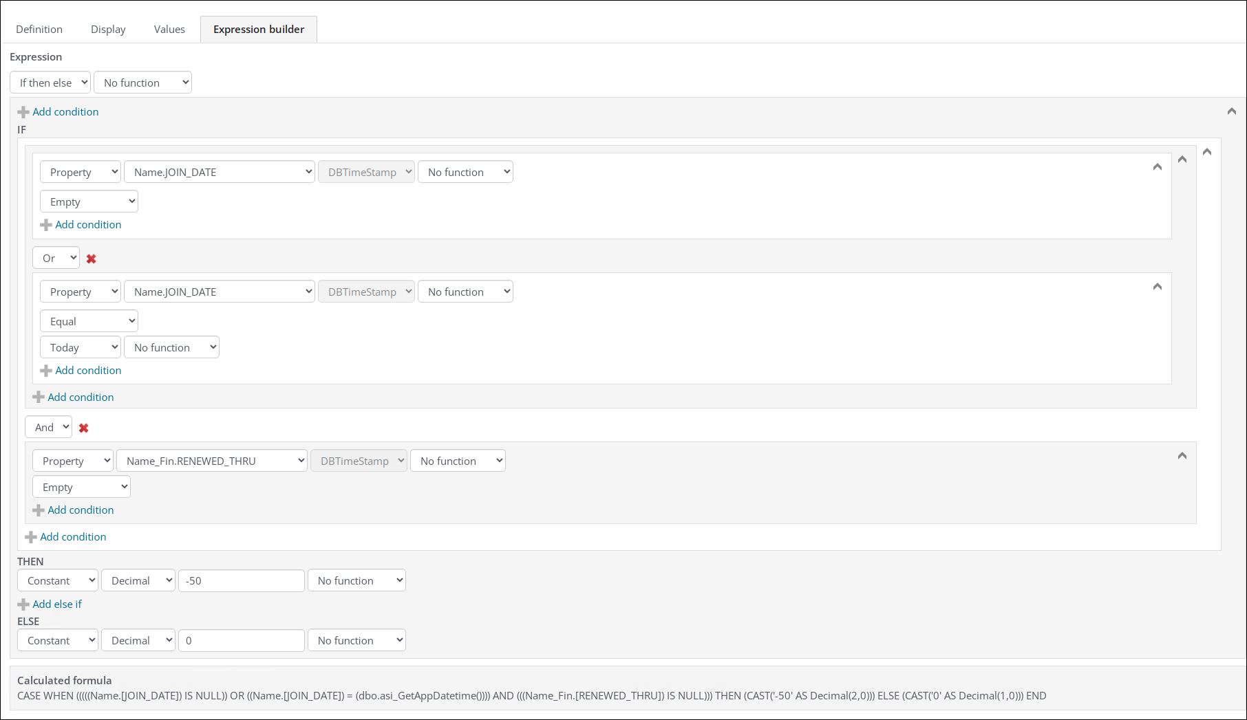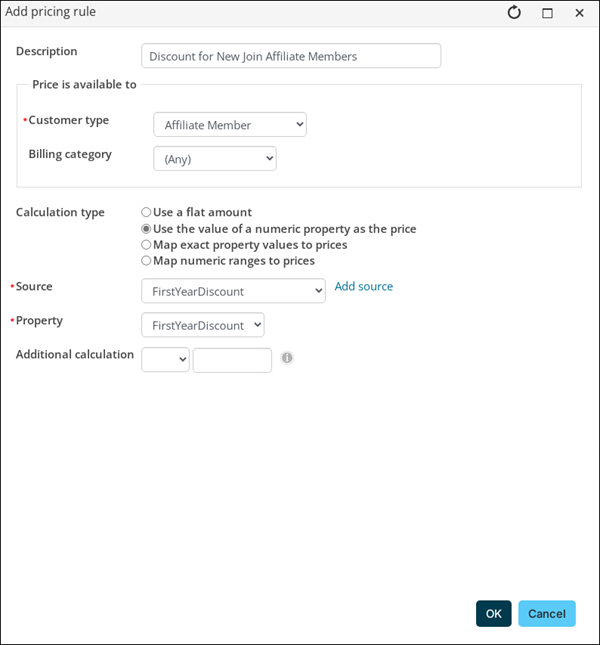 Example: The association offers a $50 discount on your first year of membership. Use the if/then/else expression to create the special pricing rule for first-year member discounts.