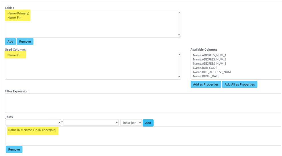 - Create the following Join: Name.ID = Name_Fin.ID (InnerJoin)