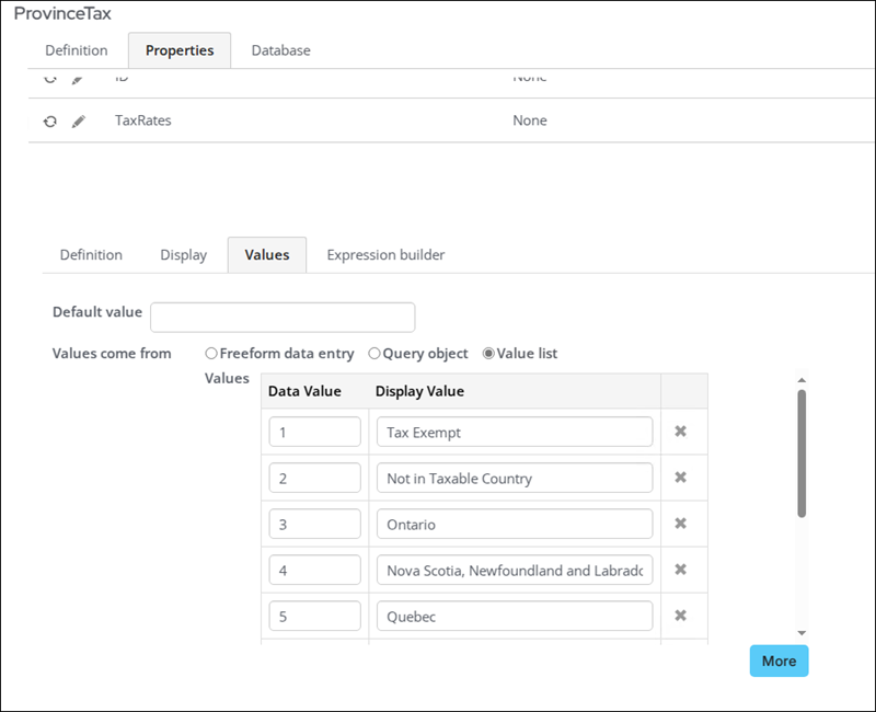 - (Values tab) Click the Values tab, then choose Value list. Create the value list that will be used to define the taxable options. This step makes it easier to create the special pricing rules later.