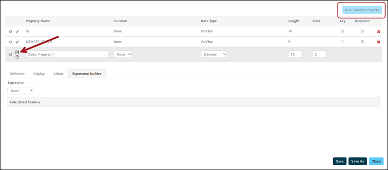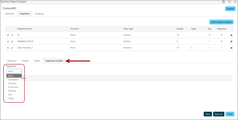 • Save - Saves changes to the Business Object Designer object. Changes will not go live in iMIS until the object has been published. You must save an object before you can publish it.