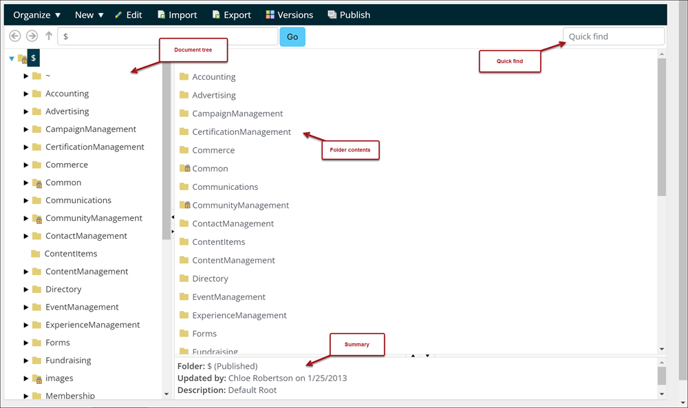 The document tree area of the Document system lists the folders available in the current view of the Document system. The folders that are visible depend on the roles and groups assigned to your user record and what feature of iMIS you are using. The full extent of the folders available in the Document system can be seen only by Log in as a system administrator.