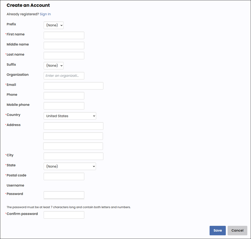 • Require address - (required when creating accounts for commerce) Select this option to display the Address fields. When enabled, a user must enter their address information to create an account.