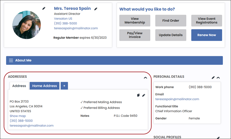 A contact can click the + icon to add another address, or click the edit icon to modify an address:
