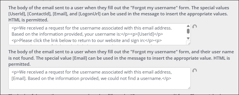 • Display forgot username link - Enable this option to display a link for contacts to request a forgotten username.