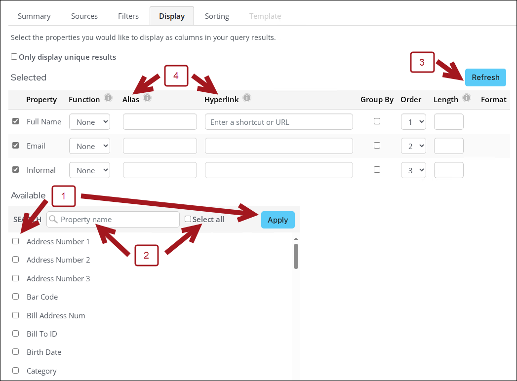 To choose which columns to display in your query results, go to the Display tab.