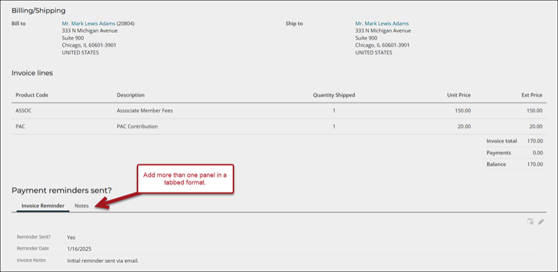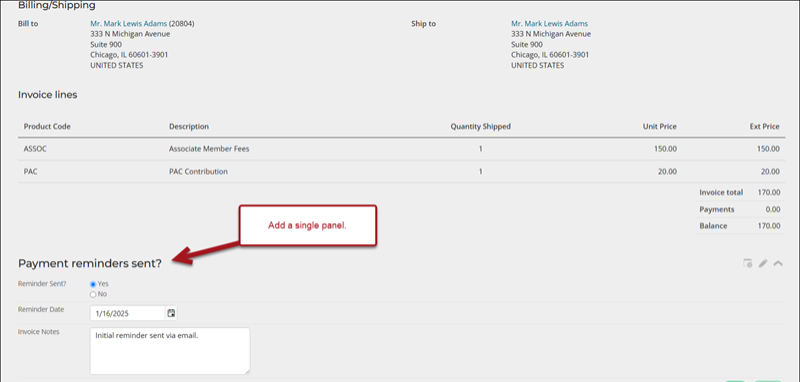 Staff users can add invoice panels to custom invoice pages. For example, a custom field for adding notes to ensure all details of a transaction are recorded accurately and available for future reference.