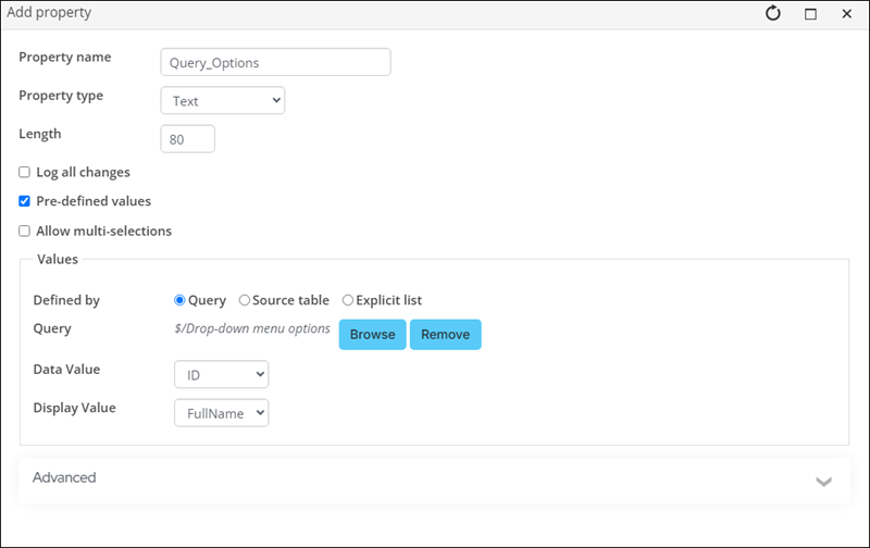 • The Defined by query option provides validation-type properties based on the query results. For example, instead of typing out a list of countries, you could select a query that displays country values.