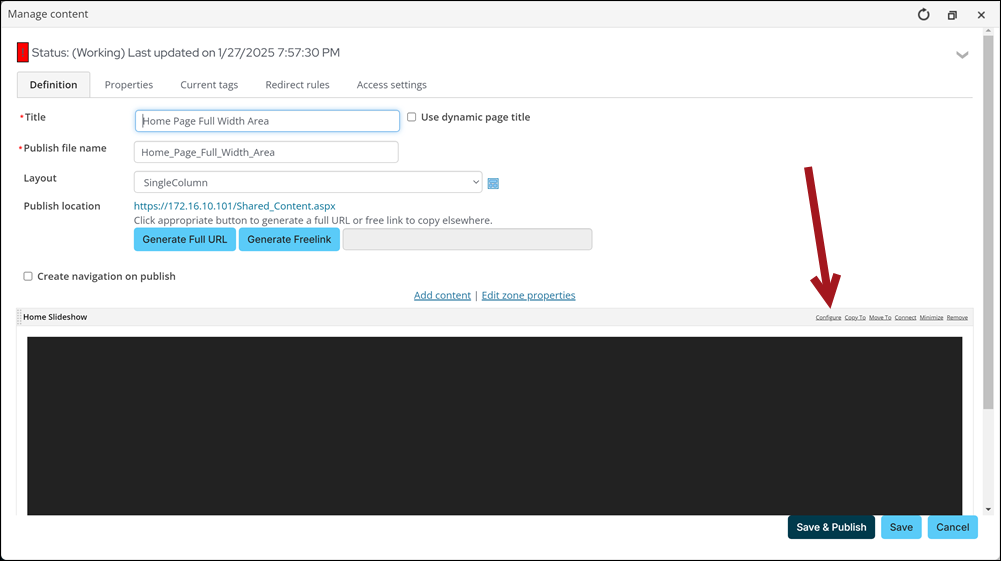 - Select Organize > Copy to copy the Home Page Full Width Area content record.