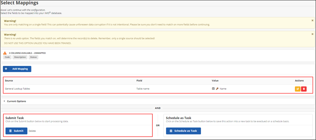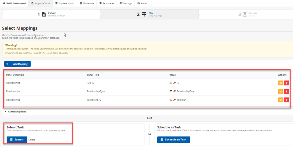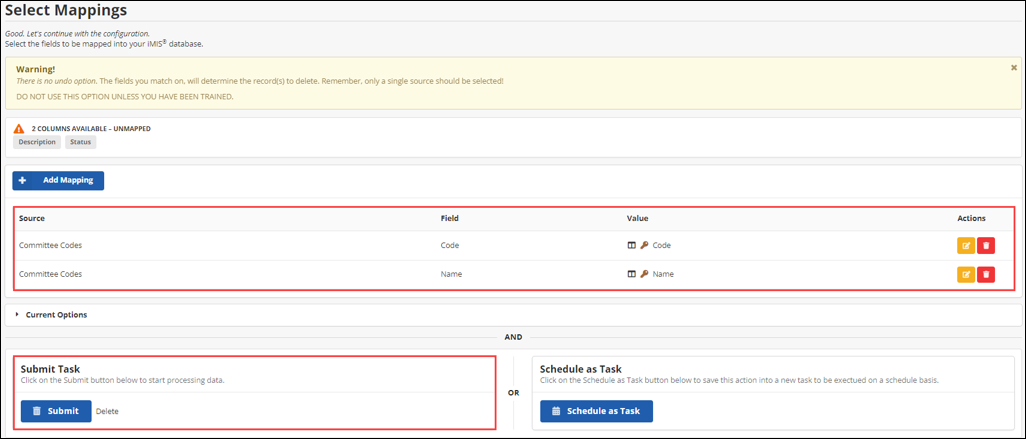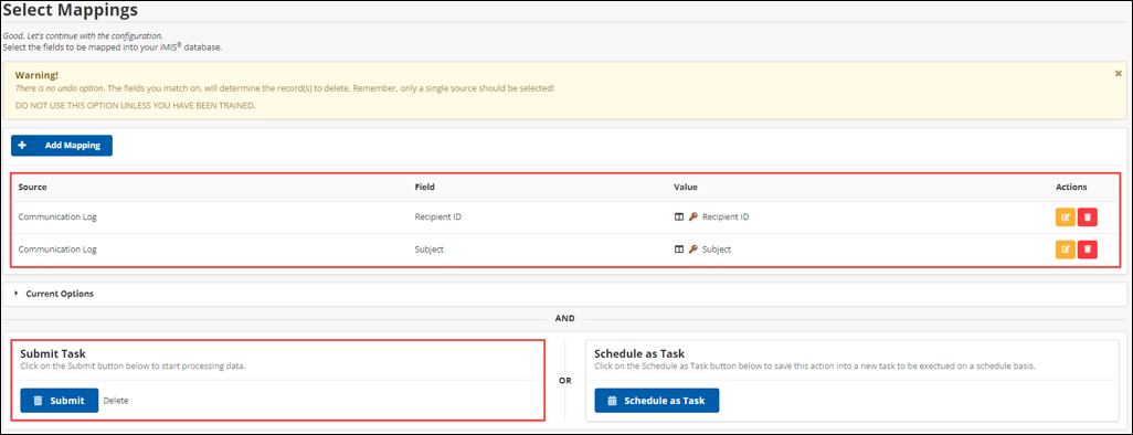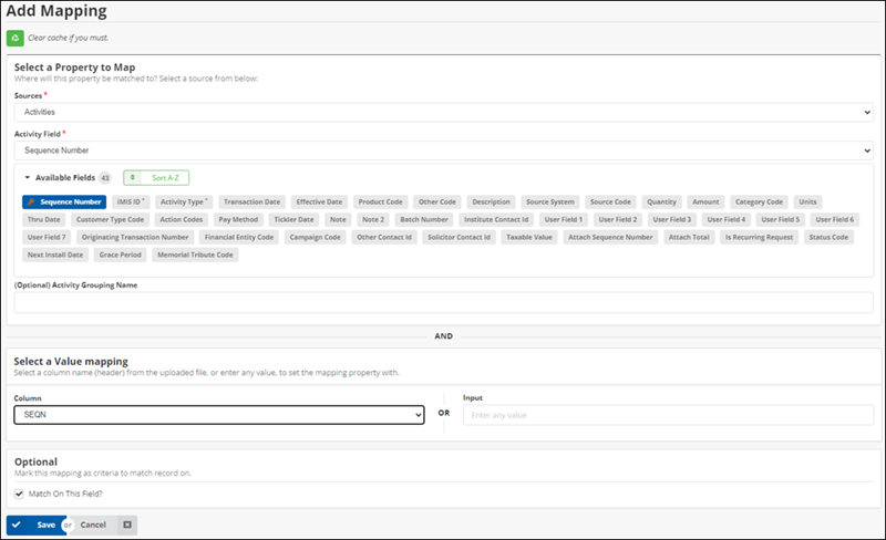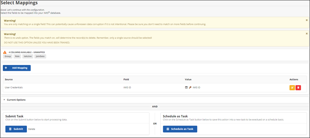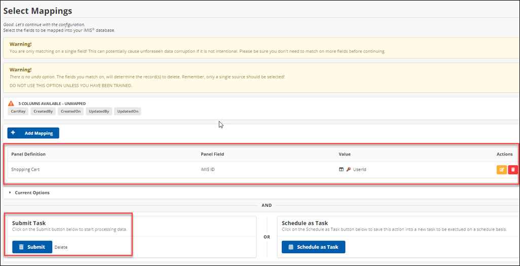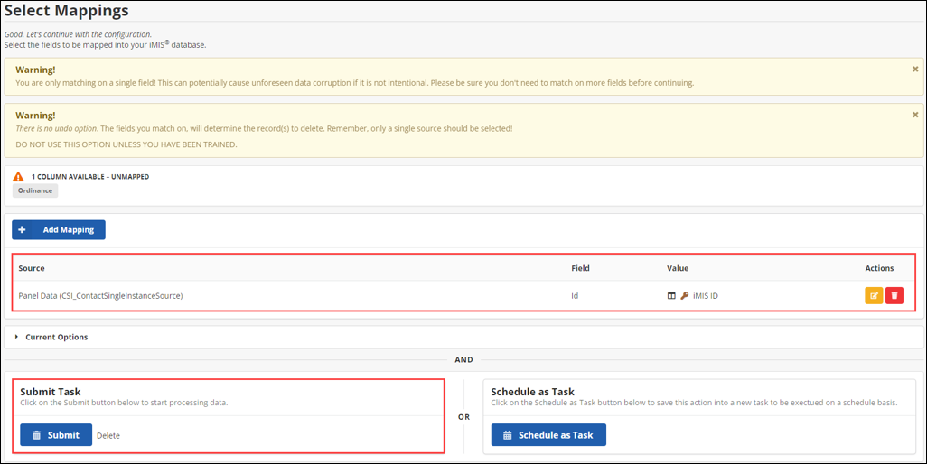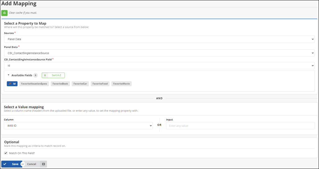 - Single Instance Panels: Matching the key field (usually iMIS ID) is highly recommended. This will delete the data for that given iMIS ID from the panel.