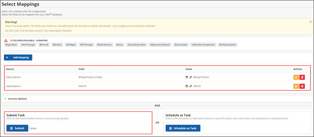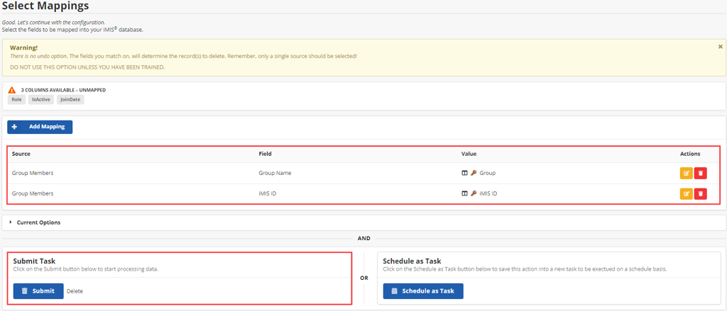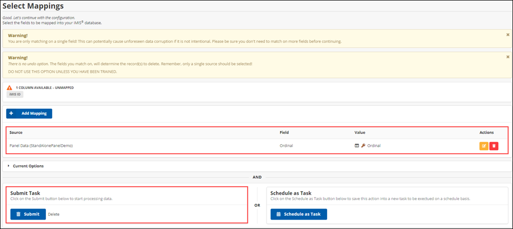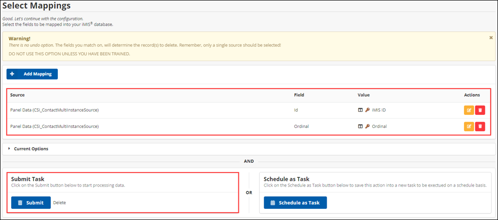 - Multiple Instance Panels: Matching on two key fields (usually iMIS ID and Ordinal) is highly recommended. Matching on only ID will delete ALL information for that ID within the panel. Matching on both the ID and Ordinal will only delete the row of data where there is a match to both. If you want to delete only part of the data from the Ordinal and not the whole Ordinal, you must use an Update action instead.