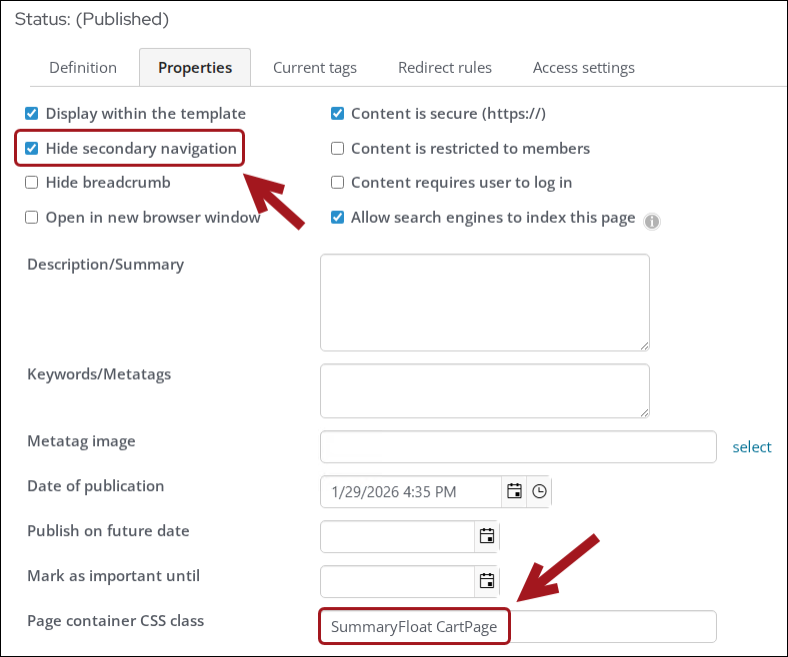 - If you would like the Order summary to remain on the page as you scroll, enable Hide secondary navigation and add the SummaryFloat and CartPage CSS classes to Page container CSS class.