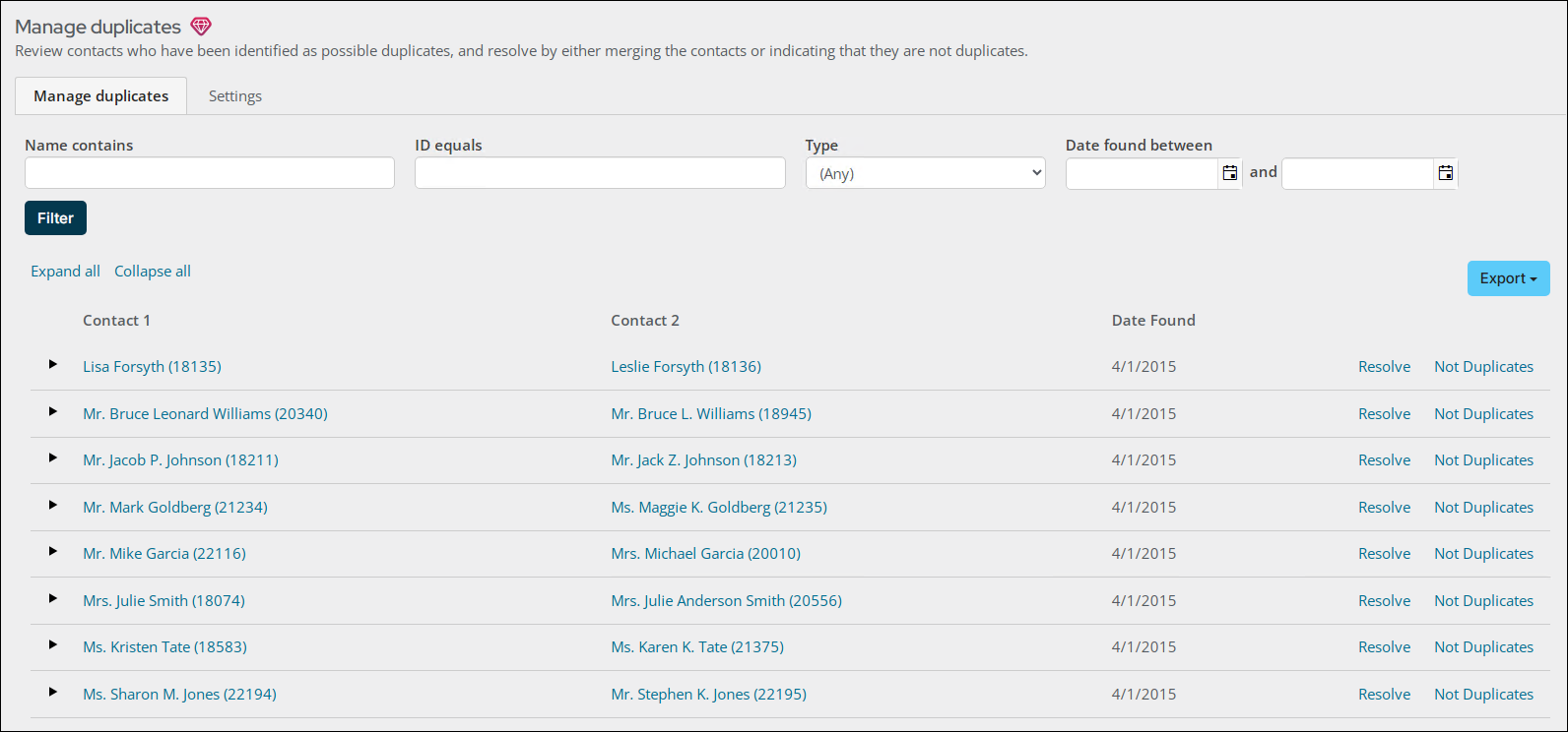 Duplicate Merge - Premium enables you to identify potential duplicate contacts or organizations and merge those duplicate records. All financial, activity, and other information associated with the duplicate record is transferred to the correct record. Information missing from the correct record can be populated with information from the duplicate record.