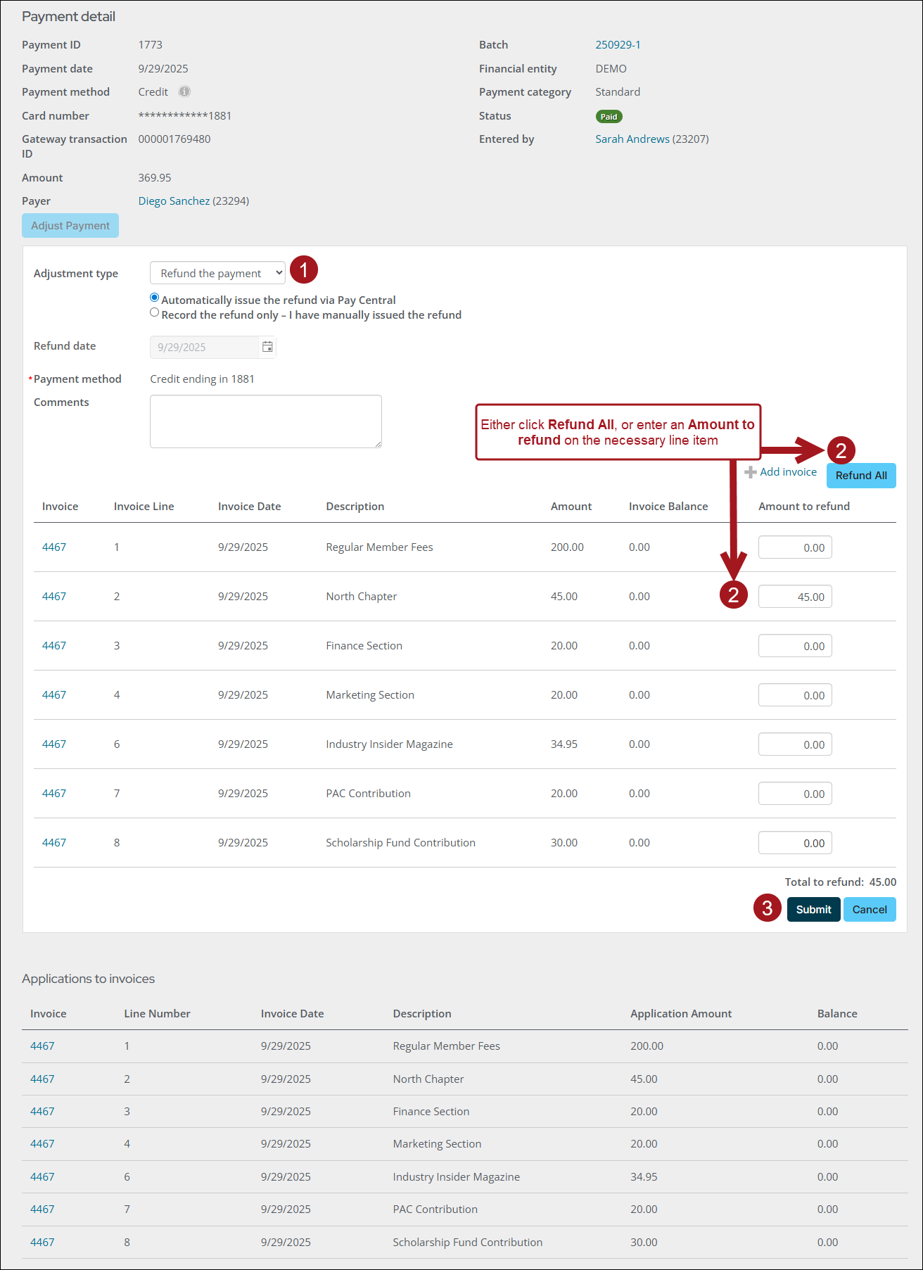 - Either enter an Amount to refund on the necessary line items, or click Refund All. The Amount to refund must be greater than 0 and less than or equal to the original payment amount.