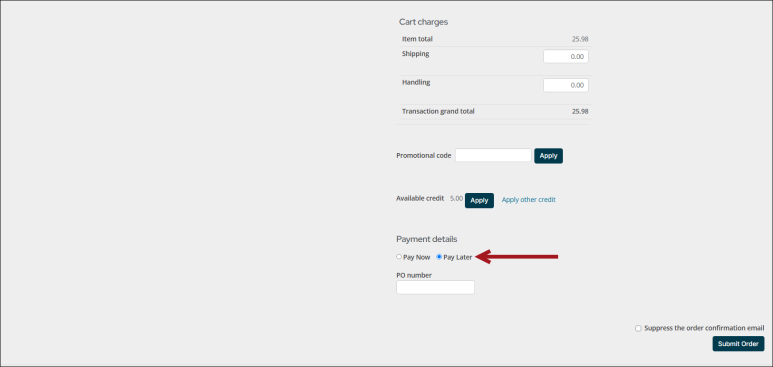 Note: Once you have selected the option to Pay Later in the cart, the option will not appear for that particular invoice again.