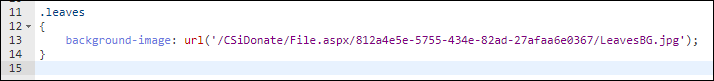 Warning! Do not include absolute paths (links containing your domain, e.g. give.example.org or testgive.example.org) in your CSS code, otherwise images that you use in live may not work in test, etc. You could inadvertently end up with a test URL pointed to live, or vice versa, for example if a test refresh is performed. Your asset URLs should always begin with a forward slash (/) and never https://.
