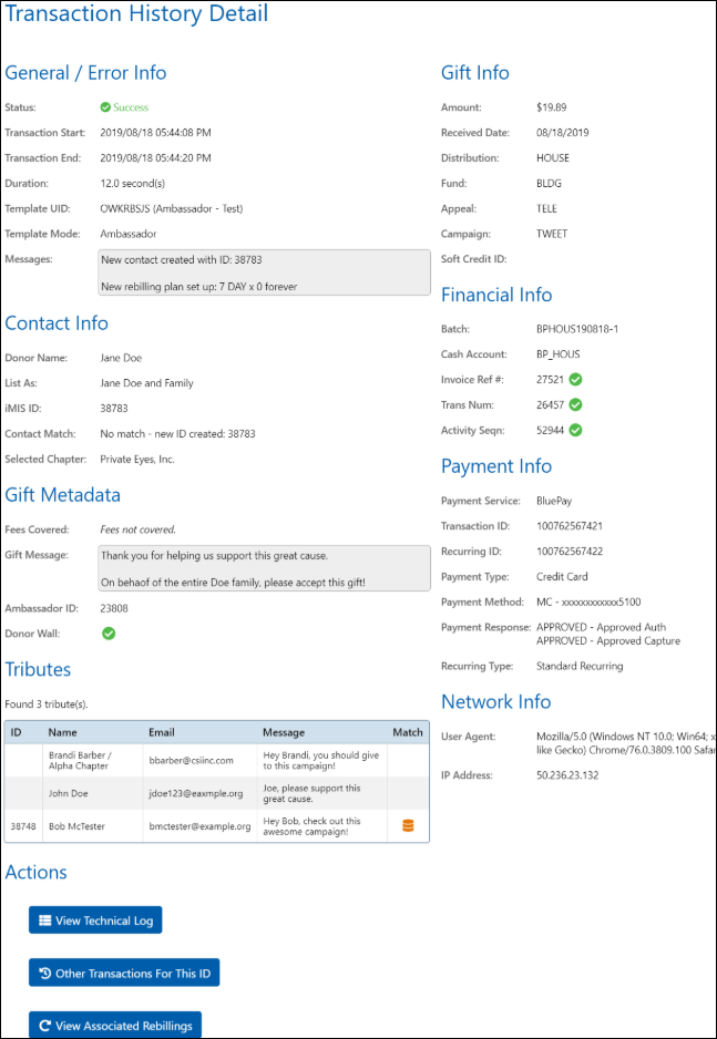 - Other Transactions For This ID – Show other donations made by this donor.