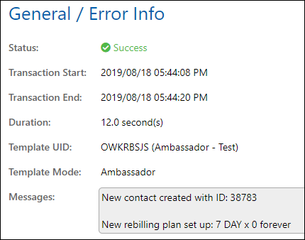 Contains information like the gift processing duration/time, which template the gift was made against, miscellaneous log messages, and in the case of failures, the error message and (most of the time) a human-friendly error description.