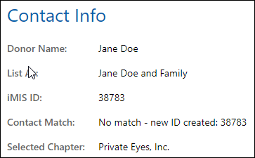 Contains contact information like the donor's name, their preferred "List As" text, iMIS ID, whether or not the contact was signed in explicitly or via a NetID, or was matched via a database lookup, or if a new contact was created. Also contains the selected chapter from the chapter dropdown for new contacts only (useful for contact lookup and merging).