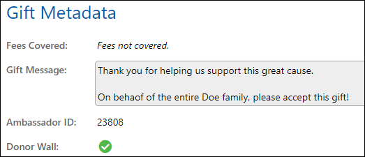 Contains the gift metadata, such as the transaction fees covered (if any), the gift message that was entered, the Ambassador or Challenge associated with this donation, and if the donor chose to be listed on the donor wall or not.