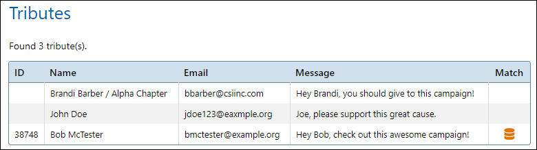 <No Icon> – The tribute is an anonymous tribute that did not match, and therefore does not have an iMIS ID.