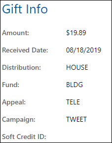 Contains basic information about the gift itself, such as the amount, date, distribution, fund, appeal, campaign, and soft credit ID (if applicable).