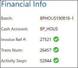 Contains financial information about the gift, such as the batch number, cash account, invoice reference #, trans #, and activity seqn #.