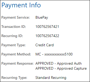 Contains information about the payment for the gift, such as payment processor/service, external transaction ID (and optionally, recurring/rebilling ID), payment type (CC/ACH), payment method (masked for security), the raw payment response received from the payment processor, and the recurring type if a recurring plan was set up.