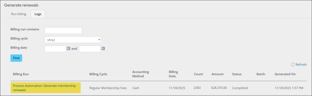When run, the Generate membership renewals task creates renewal invoices for all AutoPay members whose Paid through and Renewed through dates fall before the scheduled date and posts the related batch. The renewals generated by this task can be reviewed from the billing logs (Membership > Renewals > Generate renewals > Logs tab).