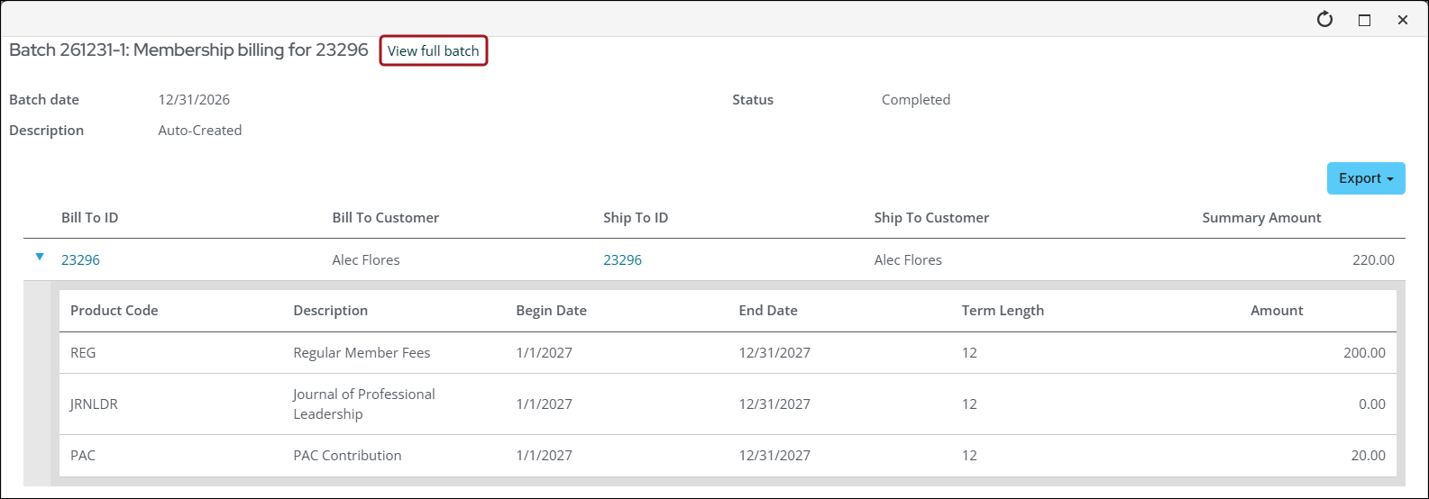 As additional single-membership renewals are generated, the transactions are added to the logged-in users' selected batch, or the default financial batch.